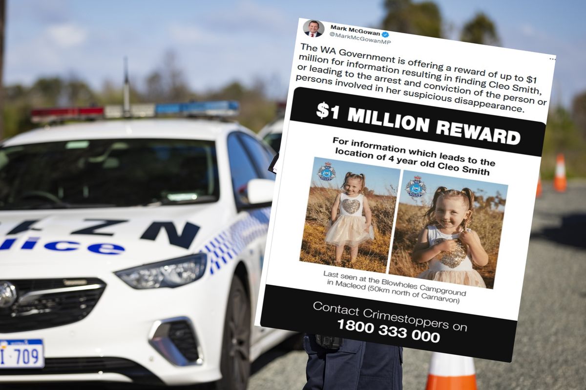This comes as Cleos biological father spent three hours speaking to officers after being asked to give a statement at Mandurah Station which is around 1000 km south of where Cleo disappeared. WA government offers one million dollar reward for missing Cleo Smith.